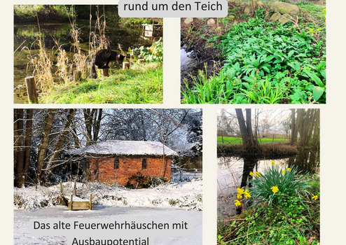 Das Baugrundstück bietet Platz für weitere Wünsche und das alte Feuerwehrhäuschen am großen Teich (ein ehemaliger Badeteich) könnte ein romantischer Ort für ein Tinyhäuschen werden. Daneben bietet der riesige Dachboden weiteres Ausbaupotential.