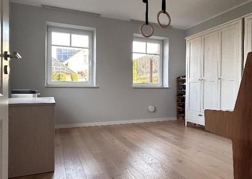 Im Obergeschoss erwarten Sie ein großzügiges Elternschlafzimmer mit angrenzender Ankleide sowie ein stilvolles Familien-Badezimmer mit Badewanne, Dusche, Doppelwaschtisch, Bidet und WC.