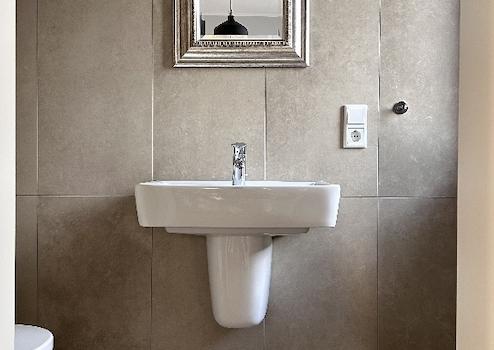 Der diskret integrierter Garderobenbereich führt weiter in den Hauswirtschaftsraum, der mit Anschlüssen für Waschmaschine und Trockner, einer zentralen Staubsaugeranlage, einer modernen Luft-/Wasser-Wärmepumpe, sowie einer Wohnraumlüftungsanlage mit Kühlfunktion ausgestattet ist.