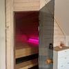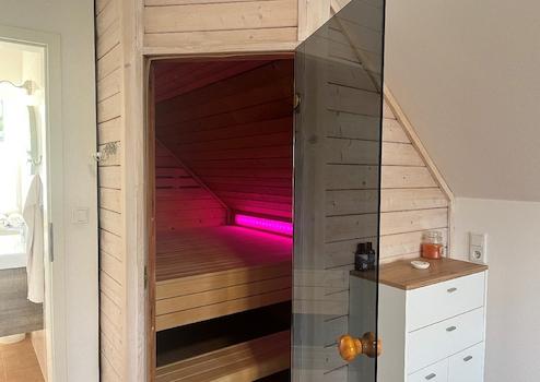 darüberliegenden Dachraum, der als Wellnessbereich mit Sauna, Dusche, WC und Waschbecken ausgebaut wurde.