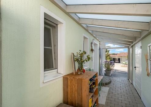 Auch außen ist alles durchdacht: eine Doppelgarage mit begehbarem Dachboden, Glasüberdachter Übergang zum Haus und integrierter Ladestation für E-Autos, dazu eine große Hofeinfahrt mit Platz für vier Autos. Eine Photovoltaikanlage (19,53 kW) und die vorbereitete Solaranlage machen das Zuhause nachhaltig und zukunftsorientiert. Die Lärchenholz-Terrasse mit Glasdach und seitlichen Windschutzpaneelen bleibt selbst an windigen Tagen ein geschützter Lieblingsplatz.