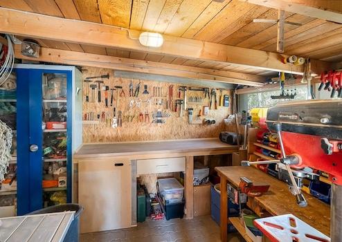 Hühnerhaus, Holzschuppen mit kleiner Werkstatt