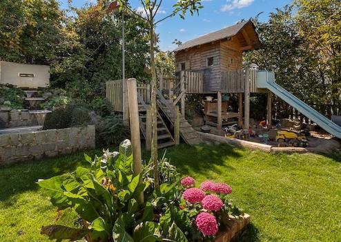 Der Garten ist ein kleines Paradies – zertifizierter Naturgarten mit Obstbäumen, Beerensträuchern, Wildkräutern und Naschgarten. Ein Kaskaden-Bachlauf bringt Lebendigkeit, der Gemüsegarten und der Hühnergarten sind eingezäunt. Eine hohe Sträucherhecke umrahmt das Grundstück, schenkt Sichtschutz und ist zugleich Lebensraum für Vögel. Für Kinder gibt es Spielturm, Rutsche, Schaukel und Sandkasten. Ein Gartenhaus mit Kaminfeuer, eine Warmwasser-Außendusche, ein Hühnerhaus sowie ein Holzschuppen mit kleiner Werkstatt runden das Bild ab.