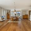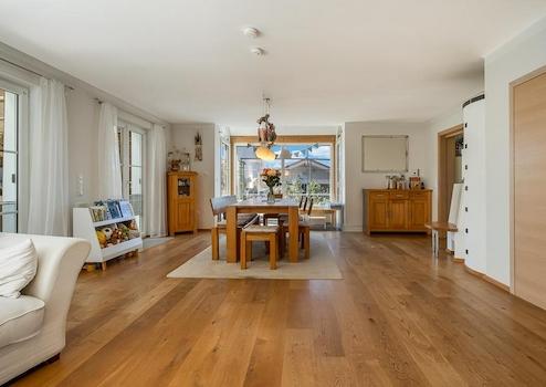 Offener Wohn- und Essbereich mit behaglichem Kachelofen und edlem Eichenparkett