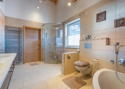 Zwei Badezimmer: Duschbad mit WC im Erdgeschoss (auch Gäste-WC) und Vollbad mit Dusche und Badewanne im Obergeschoss
