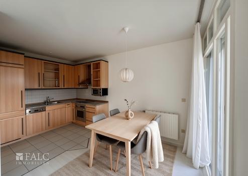 In der offenen und zeitlosen Küche mit Einbauküche haben Sie die Möglichkeit gesellige Kochabende zu genießen. Hier findet auch Ihr Esstisch samt Stühlen Platz. Nach einem ausgefüllten Tag lässt sich der Feierabend hier gut einleiten.