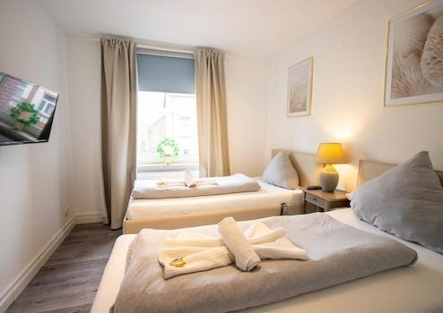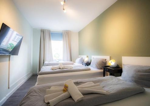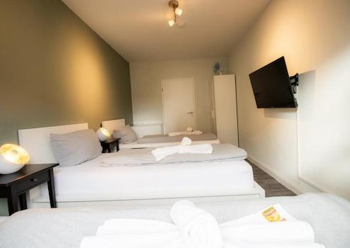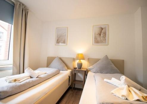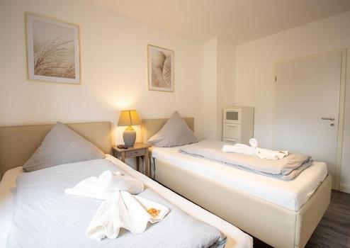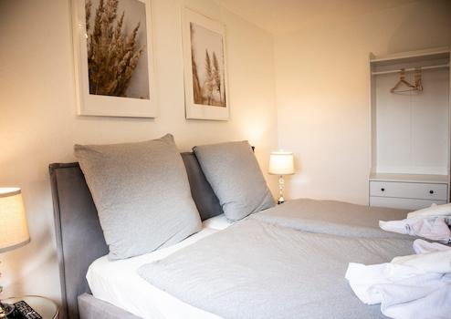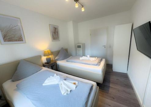 Aktuell wird die Wohnung als Ferienwohnung genutzt, weshalb auf den Fotos in einem Zimmer ein Doppelbett und im anderen zwei Einzelbetten zu sehen sind – die Möblierung wird jedoch selbstverständlich angepasst.