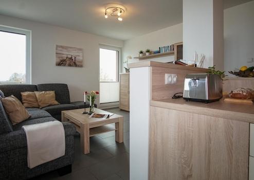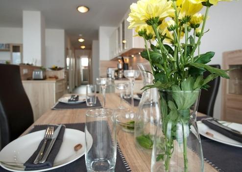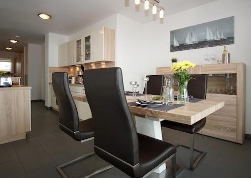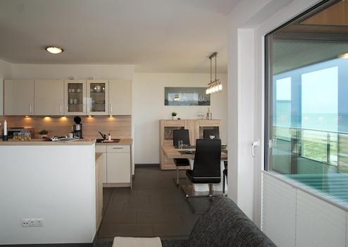 Treten Sie durch die Wohnungstür in Ihr Meerblick Penthouse ein und gelangen Sie über einen kleinen Flur in die großzügige Wohnküche mit einem ansprechenden Essbereich. Hier steht ein großzügiger Esstisch mit Platz für aktuell vier Esszimmerstühle.