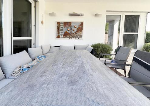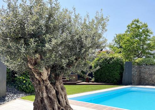 Der Außenbereich verspricht Urlaub pur, jeden Tag! Ein beheizter 10 × 4 m Salzwasserpool mit elektrischer Abdeckung, eine weitläufige Bangkirai-Terrasse, ein Whirlpool für fünf Personen und ein rund 500 Jahre alter Olivenbaum schaffen mit einer stimmungsvollen Außenbeleuchtung ein mediterranes Flair, das zum Entspannen und Genießen einlädt.