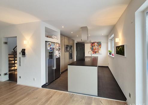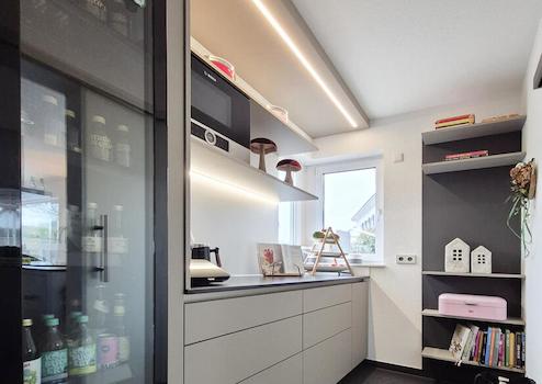 Das Herzstück des Hauses, ist der lichtdurchflutete Wohn- und Essbereich, der mit 2,75 m Deckenhöhe, bodentiefen Fenstern und einem eleganten Design-Ofen ein luxuriöses Wohlfühlambiente schafft. Die maßgefertigte Schreinerküche mit hochwertigen Gaggenau-Geräten, edler Granit-Arbeitsplatte und großzügiger Kochinsel erfüllt höchste Ansprüche, abgerundet durch ein Quooker-System für kochendes, stilles oder sprudelndes Wasser auf Knopfdruck. Eine elegant integrierte Tageslicht-Speisekammer am Eingang sorgt für kurze Wege, Ordnung und maximalen Komfort im Küchenalltag. Ein vielseitig nutzbares Zimmer, ideal als Gästezimmer oder Homeoffice, sowie ein stilvolles Gäste-WC vervollständigen das durchdachte Raumangebot des Erdgeschosses.