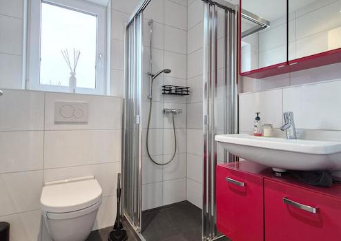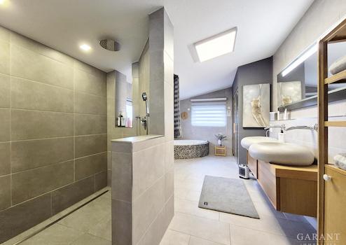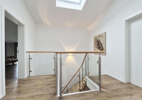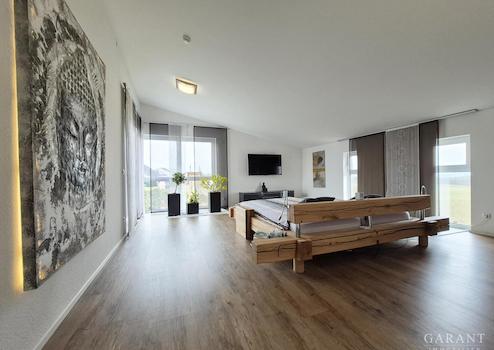 Im Obergeschoss setzt das Masterbad mit Villeroy & Boch Pure Stone, einem Whirlpool und einer finnischen Sauna luxuriöse Maßstäbe in puncto private Wellnessmomente. Klimaanlagen in allen 3 großzügigen Schlafzimmern schaffen jederzeit ein angenehmes Raumklima. Ein weiteres Badezimmer steht zur Verfügung und schafft so entspannte Abläufe im Familienalltag. Vom Balkon genießen Sie die Aussicht in den luxuriös angelegten Garten oder lassen den Blick über die angrenzenden Felder schweifen.