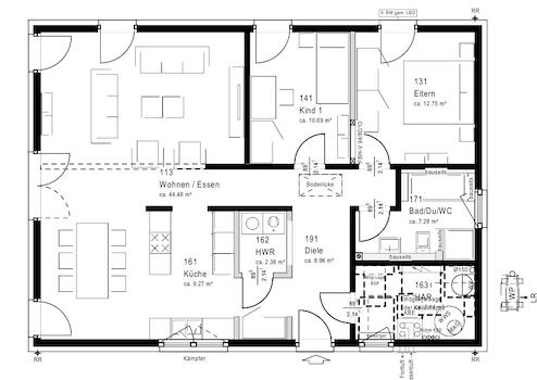 Der kompakte Bungalow-Stil bietet auf rund 103 m² Wohnfläche alles, was Familien oder Paare zum Wohlfühlen benötigen. Der großzügige Wohn- und Essbereich mit direktem Zugang in den Garten, ein Elternschlafzimmer, ein Kinderzimmer sowie Küche, Bad und zwei praktische Nebenräume schaffen ein kompaktes, funktionales Raumkonzept auf einer Ebene. Dank der Holzständerbauweise durch einen renommierten Fertighaushersteller profitieren Sie von Qualität „Made in Germany“ und hoher Flexibilität bei der Gestaltung.