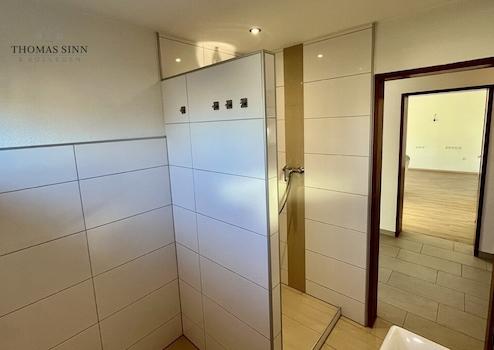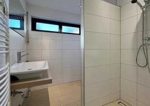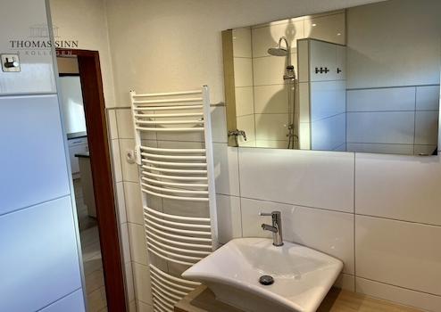 Das Badezimmer wurde bereits modernisiert und mit einer fast bodengleicher Dusche, großformatigen Wandfliesen und einem Handtuchheizkörper ausgestattet – hell, pflegeleicht und komfortabel.