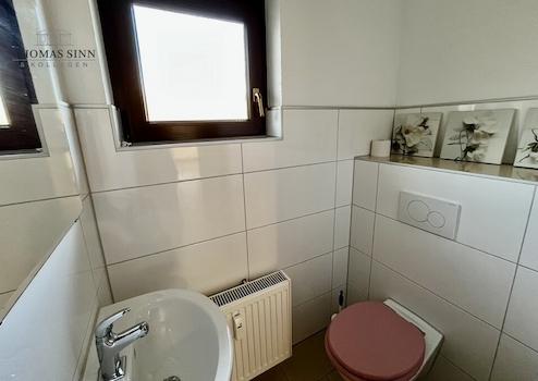 Praktisch und freundlich gestaltet befinden sich die Garderobe das separate WC am Ende des Flurs – ein funktionaler Vorteil für Besucher und Alltag.