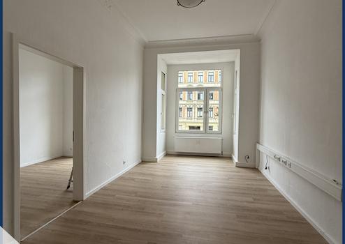 Das Wohnzimmer bildet das Herzstück der Wohnung. Es beeindruckt durch seine Größe, den schönen Deckenstuck und die stilvolle Verbindung von Altbauflair und moderner Renovierung. Hier findet problemlos eine gemütliche Wohnlandschaft, ein Esstisch und weiteres Mobiliar Platz, ohne dass der Raum an Großzügigkeit verliert. Dank der großen Fenster ist das Wohnzimmer lichtdurchflutet und bietet den ganzen Tag über ein angenehmes Wohngefühl.