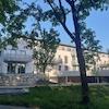 Modernes Treppenhaus mit hellem Granitbelag und Edelstahlgeländer
