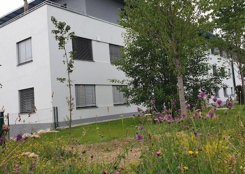 als zusätzlicher Lebensraum, angrenzend an den Gemeinschaftsgarten mit Rasenflächen, Büschen und Bäumen zur Nutzung, Pflege durch Hausmeister