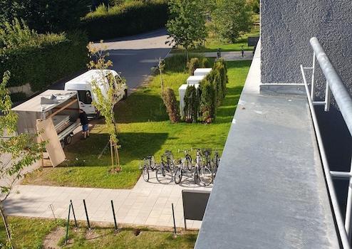 Zur Wohnung gehören 1 Stellplatz im überdachten Parkdeck (55€/Monat) und ein Stellplatz im Außenbereich (33€/Monat).