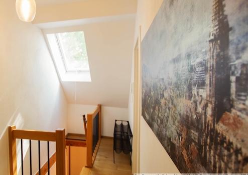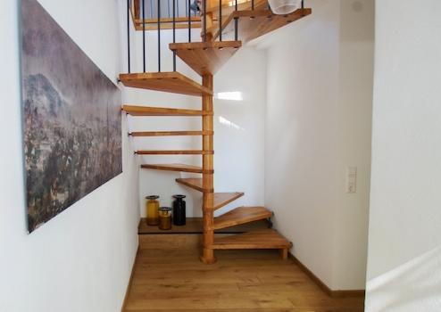 Über eine Treppe in den Flur zum Schlafzimmer sowie Gästezimmer, Bad mit Dusche/WC. Die Wendeltreppe im Flur führt zum Dachgeschoss mit Arbeitsbereich, Entspannungecke sowie Waschbereich.