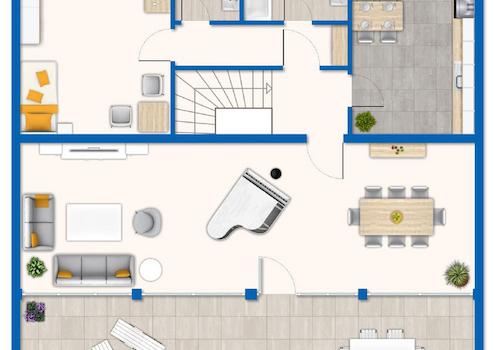 Herzstück des Hauses ist der offene Wohn- und Essbereich mit direktem Zugang zur geschlossenen Loggia. Hier genießen Sie entspannte Stunden mit herrlichem Blick in die grüne Sauerländer Natur der perfekte Ort zum Abschalten und Wohlfühlen.