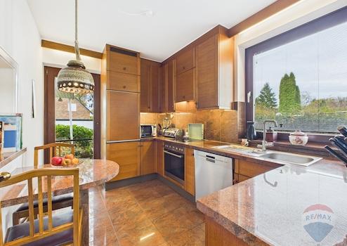 -Einbauküche mit hochwertiger Granitarbeitsplatte inkl. E-Geräte + Zugang zur Terrasse + Durchreiche