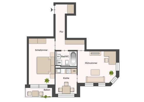 Die 2-Zimmer-Wohnung erstreckt sich auf rund 65 Quadratmetern. Die Wohnräume sind hell und gut geschnitten. Über den geräumigen Flur gelant man in das Wohnzimmer mit angrenzender separater Küche und Zugang zum Balkon sowie das helle Schlafzimmer und das gemütliche Bad mit Wanne.