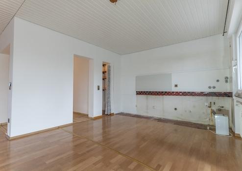 Zur linken Seite befindet sich das hell geflieste Gäste-WC. Gleich im Anschluss erreichen Sie die Küche, die durch eine Abstellkammer zusätzlichen Stauraum bietet. Von hier aus haben Sie direkten Zugang zum offenen Wohn-/ und Essbereich, der durch seine großzügige Raumgestaltung ein angenehmes Wohngefühl schafft.