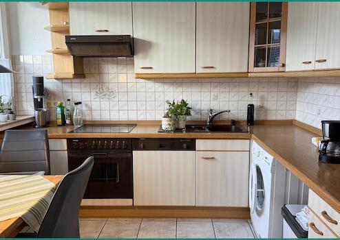 Die helle und gemütliche Wohnung verfügt über weiße Innentüren mit Metallarmaturen. Die Wände sind mit einer weiß gestrichen Fließtapete versehen. Der Boden der Eingangsdiele ist pflegeleicht mit einer grauen Fliese ausgelegt. Ein praktischer Abstellraum mit Regalen bietet Ihnen Stauraum außerhalb des Kellerraums. Die Küche verfügt über einen quadratischen Zuschnitt und genügend Platz fürs alltägliche. Von der Küche gelangen Sie...