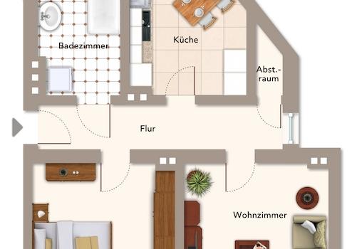 Die Wohnung überzeugt mit einem durchdachten Grundriss, der Balkon ist von der Küche aus zugänglich. Zu der Küche gehört auch eine Einbauküche.