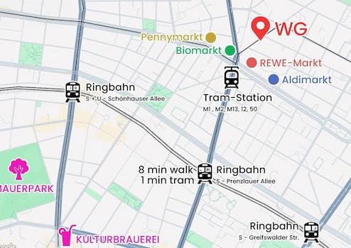 Wir starten eine WG in Berlin-Weissennsee, 100m von Pberg entfernt. Direkt an der M1, M2 und M13 und nur 8 Minuten zu Fuß zur Ring Station Prenzlauer Allee. In 1 Minute mit der Tram an der Ringbahn!