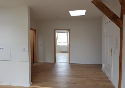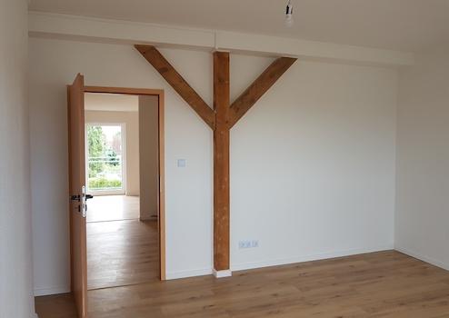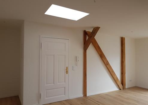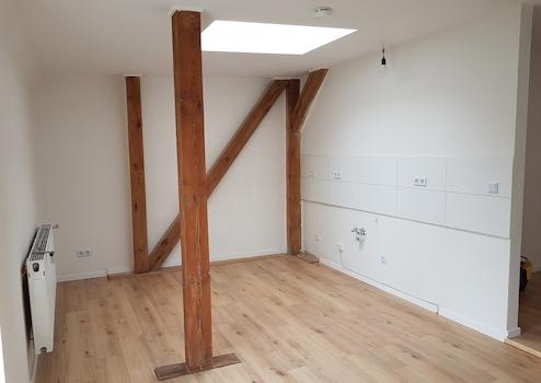 Neben einem gemütlichen Schlafzimmer erwartet Sie ein vollständig saniertes und modernes Duschbad, das keine Wünsche offenlässt. Sichtbare Dachbalken verleihen den Wohnräumen ein einzigartiges Flair und schaffen eine behagliche Wohnatmosphäre, die bereits darauf wartet, mit Ihrer persönlichen Einrichtung zum Leben erweckt zu werden.