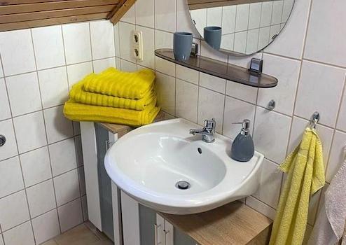 ### Please note the availability date! Bitte das Verfügbarkeitsdatum beachten! ### neu möbliertes Apartment in Förtha, nur etwa 15 Minuten von Eisenach entfernt; helles Wohnzimmer mit neuer Couch, Vitrine, Sideboard, TV und Esstisch (Wichtig: Einige Bilder zeigen die Wohnung noch im halbfertigen Zusand, inzwischen ist die Whg bezugsfertig möbliert!); neue EBK in einer Seitennische; kleines Schlafzimmer mit Einzelbett und Kleiderschrank; Bad mit Dusche und WC (Wichtig: Das Waschbecken befindet sich unter einer Schräge, daher ideal für Personen bis 1,80m Größe geeignet!); Wohnungsflur mit Garderobe; Vorraum mit Ausgang zum Balkon; Waschmaschine und WLAN vorhanden; Pauschalmiete 825,00 Euro (bei max. 1 Person); Kaution 1.000,00 Euro; monatlicher Heizkostenzuschlag 30,00 Euro von Oktober bis einschließlich April; Mindestmietdauer 3 Monate; Pflichtangaben zum Energieausweis: Energieausweis gültig bis: 30.10.2033; Baujahr Gebäude: 1920; Energieausweis: nach Verbrauch; Energieverbrauch: 74.1 kWh/(m²a); Energieeffizienzklasse: B; Primärer Energieträger: Erdgas H