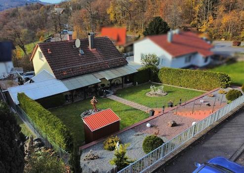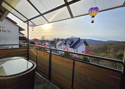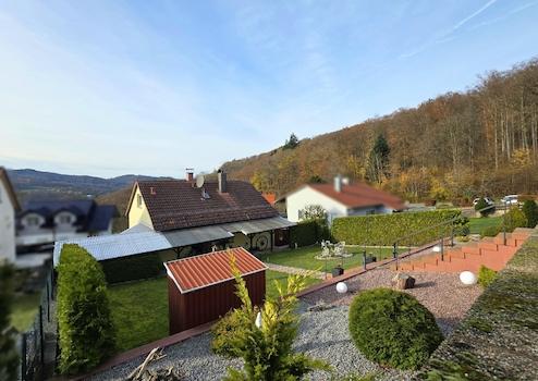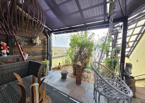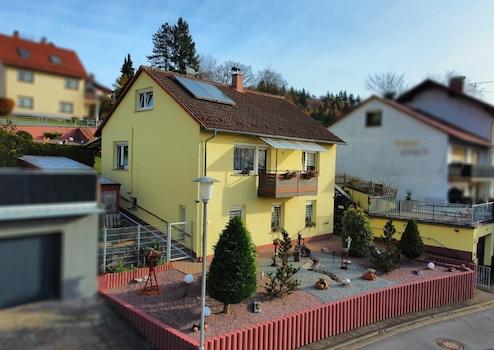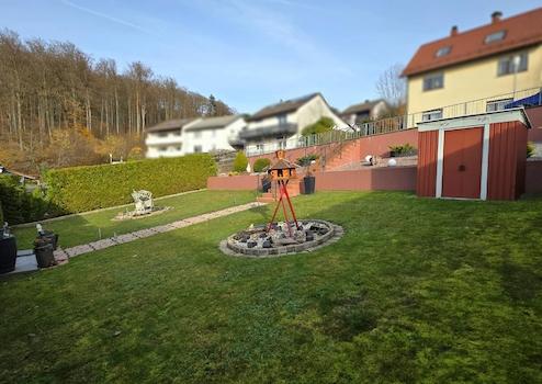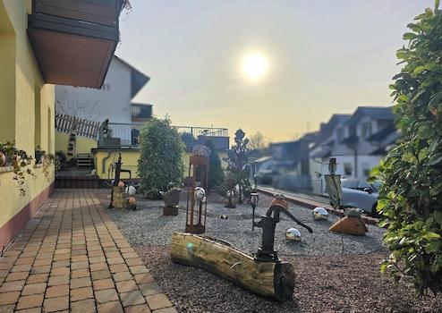 Besonders die schön gestaltete Terrasse lädt zum Verweilen ein – hier genießen Sie in gepflegter Atmosphäre den Blick in den Garten und über den Odenwald.