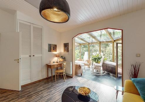 ◼︎ Der ganzjährig nutzbare, beheizte Wintergarten mit Blick ins Grüne ist Teil der Einliegerwohnung und bietet zusätzlichen Raum zum Entspannen.