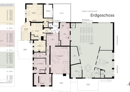 ◼︎ Das Gebäude erstreckt sich über 720 m² (Gesamtnutzfläche nach DIN 277), größtenteils auf einer Ebene und umfasst zwei Wohnungen, (178 m² + 105 m²), sowie eine 249 m² große Halle mit Büroräumen.