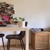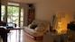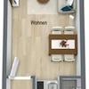 Der Wohn-/Schlafraum ist mit Laminat in Holzoptik ausgelegt. Eine große, doppelt verglaste Fensterfront sorgt für viel Tageslicht und führt auf die angrenzende Terrasse, der sich über die gesamte Breite des Apartments erstreckt. Eine integrierte, funktionale Küchenzeile am Ende des Raumes ist mit einer Spüle sowie Ober- und Unterschränken und Kühlschrank ausgestattet. Über der Eingangstür befindet sich eine zusätzliche Abstellfläche, die sich über die Länge des Flurs erstreckt und ideal zur Lagerung von Haushaltsgeräten oder saisonaler Kleidung ist.