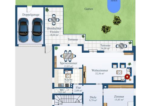 + Große Terrasse mit Garten und Teich – eine grüne Oase mit viel Raum zum Entspannen, Spielen und Genießen, ergänzt durch einen einladenden Freisitz.