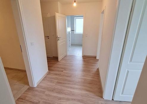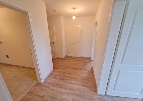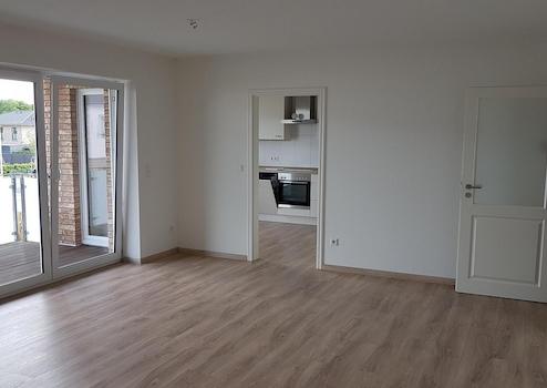Die Wohnung verfügt über zwei Schlafzimmer, Wohnzimmer mit offener Küche inkl. moderner, heller Einbauküche, Duschbad, Gäste-WC, HWR (m. Waschmaschinen-Anschluss) und einen großzügigen und teilüberdachten Balkon mit Süd-Ost-Ausrichtung sowie einem Abstellraum direkt auf dem Balkon (z.B. für Stuhlauflagen oder kühle Getränke). Das Wohnzimmer ist hell und hat große, bodentiefe Fenster.