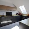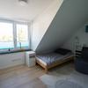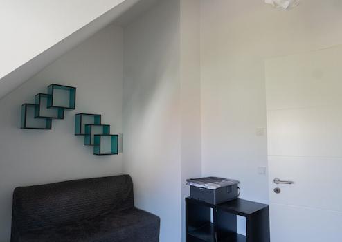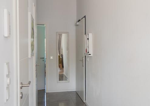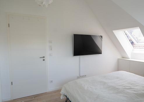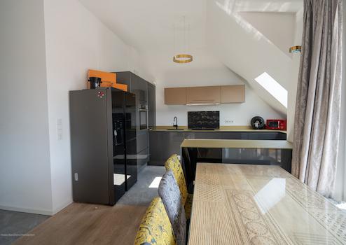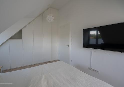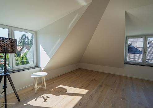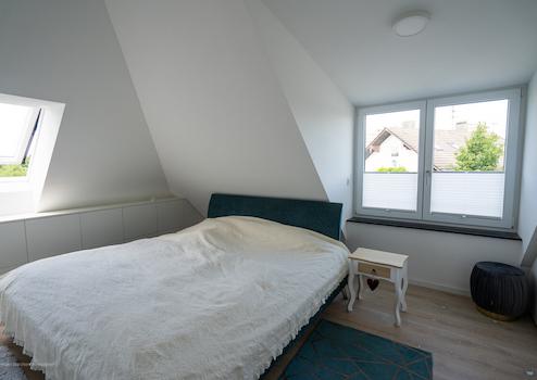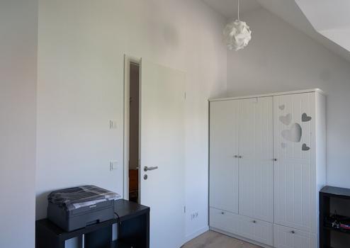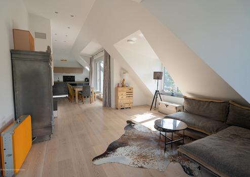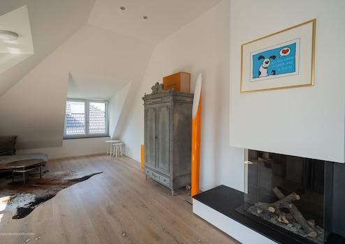 Die konzeptionelle Idee des Architekten kommt hier sofort durch werthaltige Bauweise und die hervorragende Raumgestaltung zum Ausdruck. Hochwertige Echtholz-Parkettböden (Landhausdiele Eiche Alpino rustik) in Wohn-Esszimmer, Schlafzimmer und den Kinderzimmern zieren dieses Domizil. Edle Bodenfliesen (Hochglanz) wurden in der Diele und in der Küche verlegt. In Diele und Wohnzimmer wurden hübsche Deckenspots installiert. Ein weiteres Highlight ist der verglaste Ethanol-Kamin im Wohn- Esszimmer. Im Schlafzimmer wurde ein schicker Einbauschrank in der Farbe Weiß und ein Sideboard in die Dachschräge integriert. Die Dachterrasse ist mit WPC-Belag ausgestattet. Selbstverständlich ist die Markise elektrisch. Eine Video-Gegensprechanlage ist vorhanden.