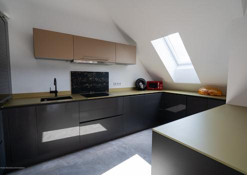 Eine u-förmige Luxus-Einbauküche in modernem Design mit Spüle mit Armatur und Markeneinbaugeräten wie vollintegrierte Spülmaschine, Waschmaschine, Induktionskochfeld, Dunstabzug, Backofen auf Sichthöhe, einem Amerikanischen Kühlschrank sowie verschiedenen Unterbau- und Hängeschränken ist vorhanden. Eine moderne Glasarbeitsplatte aus stabilem Sicherheitsglas ist vorhanden.