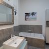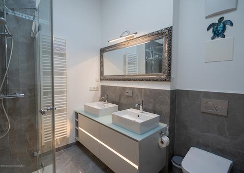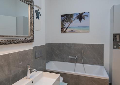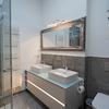 Im Tageslichtbad befinden sich eine Badewanne, eine Toilette, ein Unterschrank mit zwei Waschbecken und Glasablage, ein Handtuchheizkörper, eine bodengleiche Dusche mit Glaswand und ein elektrisch gesteuertes Dachflächenfenster.