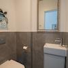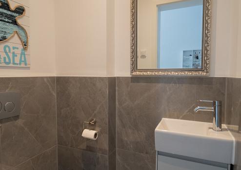 Das Gäste-WC verfügt über eine Toilette sowie ein Waschbecken mit Unterschrank und einem Spiegel. Hier wurden die Wände halbhoch gefliest.