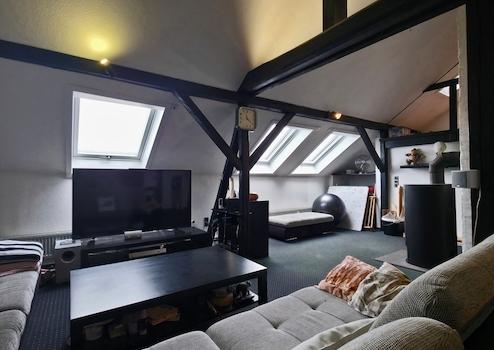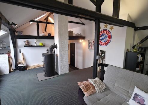 Im oberen Bereich der Wohnung empfängt Sie ein offenes Wohnstudio mit einem gemütlichen Kaminofen. Zusätzlich gibt es ein Tageslichtbad mit Dusche sowie einen praktischen Abstellraum der sich hervorragend als Arbeitsplatz für ein Homeoffice nutzen lässt. Ein weiteres Schlafzimmer mit angeschlossenem Ankleidezimmer ergänzt das Angebot. Bei Bedarf kann dieser Bereich auch in zwei eigene Räume unterteilt werden.