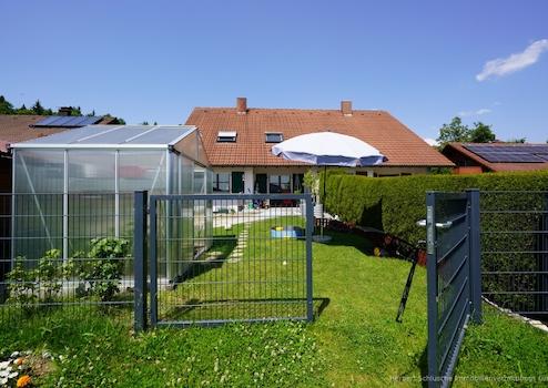 Die interessante neue Gartengestaltung mit Sonnenterrasse, Gewächshaus und einem Gartenhaus und ein schöner Westbalkon laden Sie zum Entspannen und Verweilen ein.