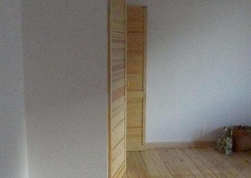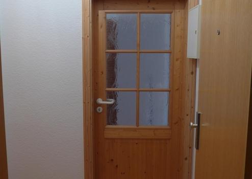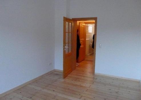 Böden: massive frisch abgeschliffene Weichholzdielen, neue Kieferntüren, die Decken und Wände sind mit Raufaser tapeziert und weiß gestrichen.