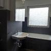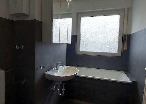 Das Wannenbad mit Fenster wurde fugenlos mit Microbeton gestaltet. Der einheitliche Laminatboden in Eiche natur sorgt in allen Räumen für ein warmes Wohngefühl.