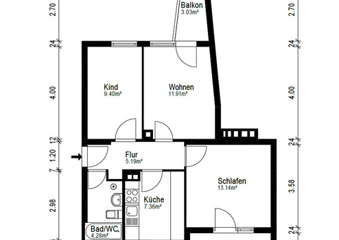 Zimmer 1 (ca. 9,40 m²): kompakter, gemütlicher Grundriss ohne Balkon.