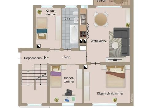 Der Grundriss ist praktisch und familienfreundlich gestaltet: Der helle Wohnbereich mit integrierter Küche bildet das Herzstück der Wohnung und ermöglicht den direkten Zugang zum sonnigen Balkon. Zusätzlich stehen ein Schlafzimmer sowie zwei kompakte Kinderzimmer zur Verfügung. Das Tageslichtbad ist mit Badewanne, Waschbecken und Waschmaschinenanschluss ausgestattet und entspricht noch dem ursprünglichen Baustil.