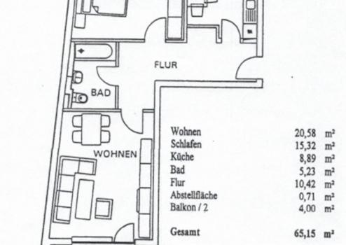Wohnzimmer, Schlafzimmer, Küche mit Fenster, Bad, Flur, Balkon Kellerabteil