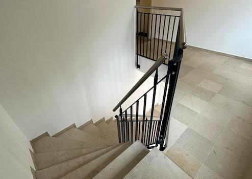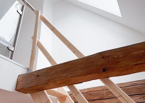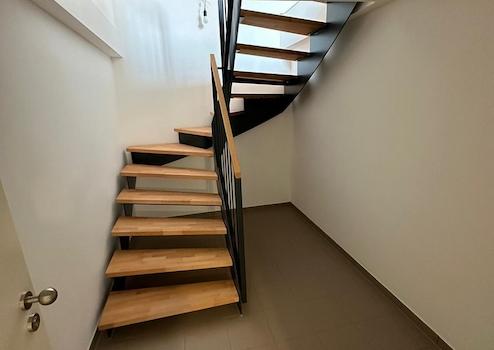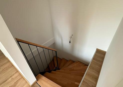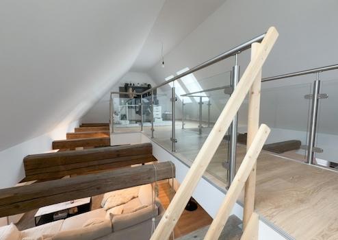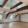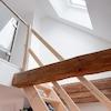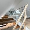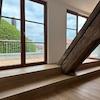 Die Wohnung ist mit einer Empore verbunden, die über eine Holztreppe vom Wohnzimmer aus erreichbar ist und mit einer Glasbalustrade umfasst wurde. Sie verfügt über insgesamt vier Zimmer, die flexibel als Schlafzimmer, Büro oder Gästezimmer genutzt werden können. Damit eignet sich das Objekt ideal für Familien, Paare mit Homeoffice-Bedarf oder Menschen, die Wert auf viel Raum und besondere Architektur legen.